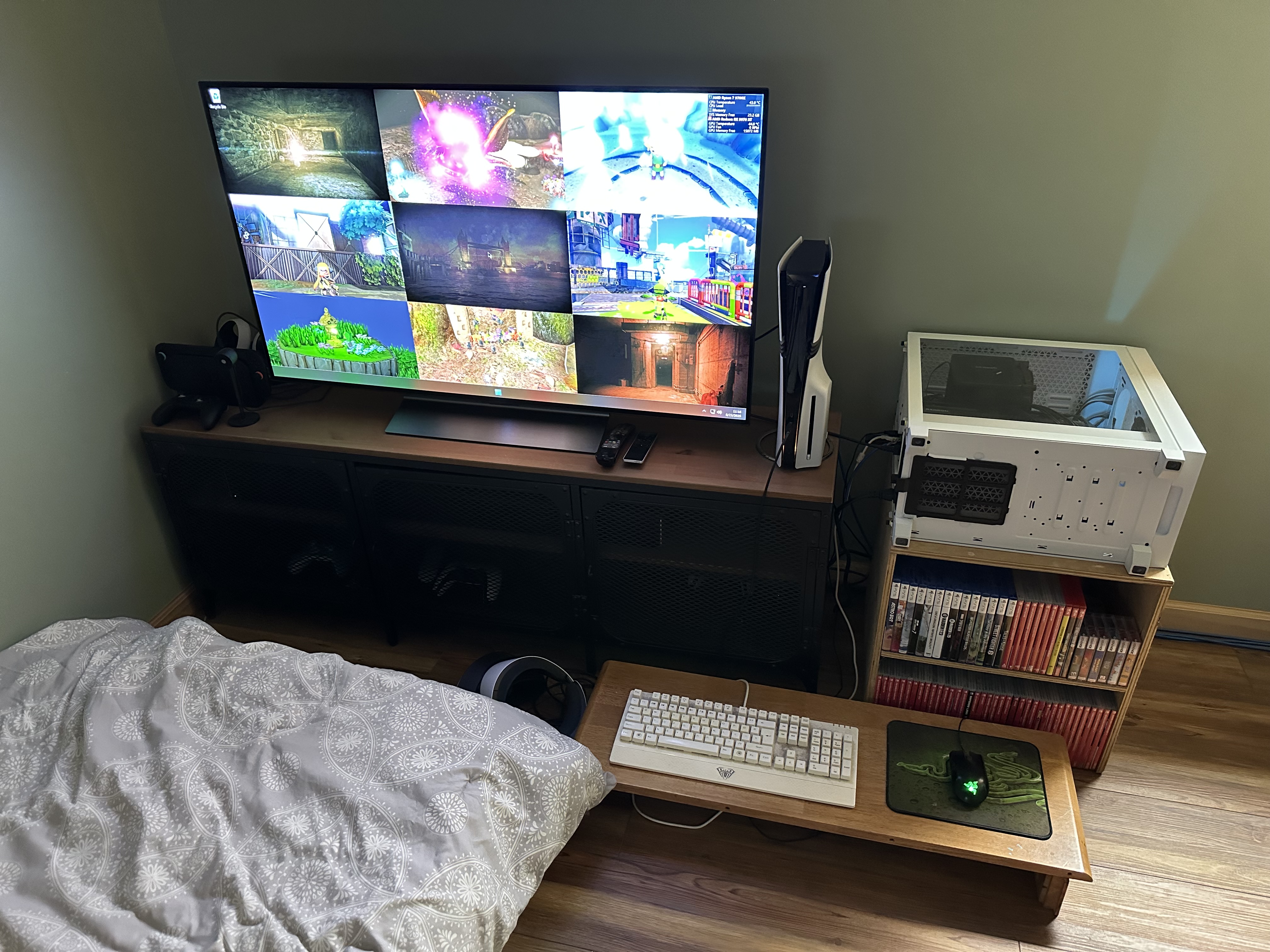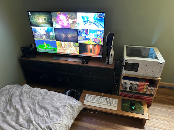 Here is our modern-day gaming setup, in Sniper's room. Sniper's PC is there, along with a Nintendo Switch 2, a Sony PlayStation 5 Pro, and a PSVR2 setup. Click for the full-sized image.